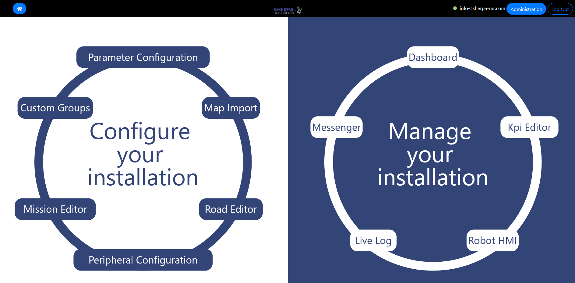 Comme nous venons de faire une nouvelle configuration du Sherpa, il va être complètement désorienté par rapport à la nouvelle cartographie. Depuis l’écran du Sherpa (clic Maison), vous devriez avoir l’indicateur de position au rouge.