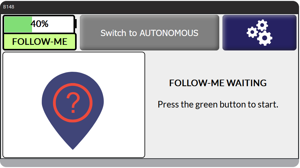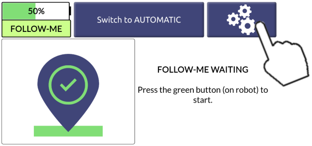 Après le démarrage du robot, on peut soit passer en mode Follow-Me, soit pousser le robot après avoir débloqué les freins. C’est nécessaire quand les AMR sont parqués dans la salle de TP à l’IUT, pour les faire passer dans un espace restreint, les charger dans un camion …