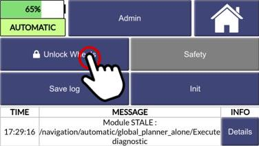 Attention, ce n’est pas parce que le Sherpa est débloqué que les sécurités ne sont plus actives. Il faut pousser le robot en conserver le maximum de distance entre le robot et ses pieds sinon le Lidar appliquera la sécurité et le robot bloquera les freins. On préfèrera donc pousser le robot que de le tirer vers soi.