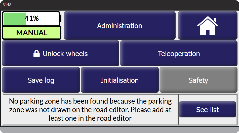 Pour accéder au mode Stand-by : il faut s’assurer que le robot ait été réarmé. Après un démarrage ou un arrêt d’urgence il est nécessaire d’appuyer sur le bouton de réarmement. Le bouton de réarmement est uniquement disponible sur le Sherpa B148 à l’IUT.
