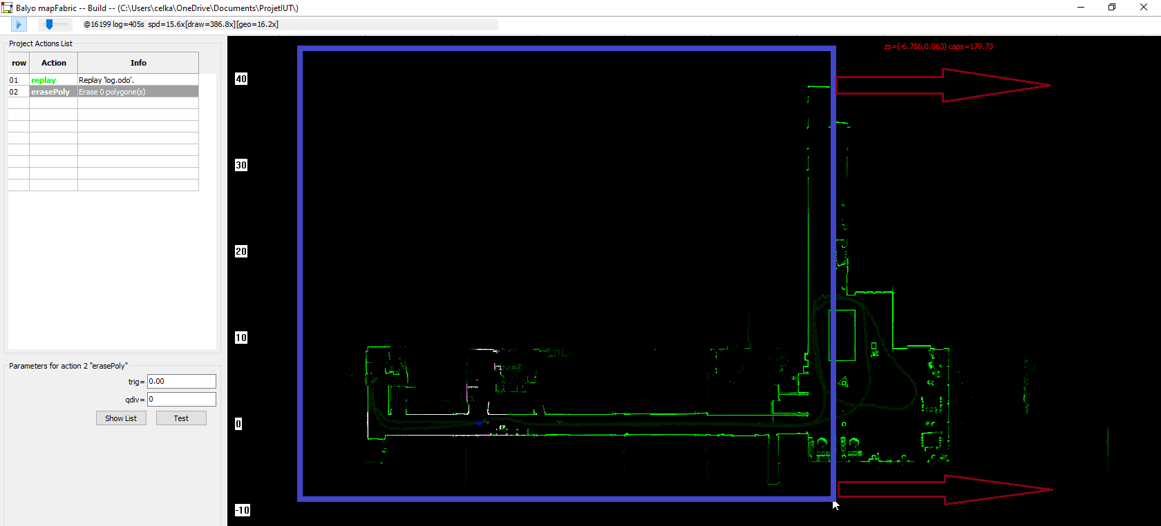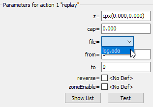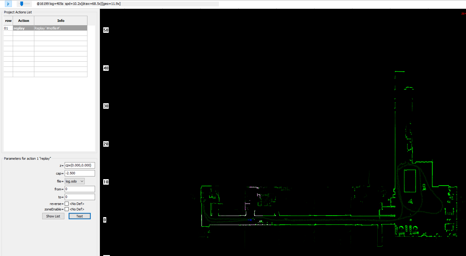 z =: correspond aux coordonnées du robot en début de log. Pour décaler la carte dans un sens, il est possible de rentrer un offset de départ du log. Dans le cas d’un log unique (installation simple) ce paramètre peut rester à zéroCap =: Ce paramètre permet de décaler l’orientation du robot en début de log. Cela permet de faire tourner la carte autour du point de départ du robot. Si en créant le log le robot n’était pas aligné à un mur, cela permet de corriger cette erreur.File =: Ce paramètre est le log à rejouer. Il suffit de sélectionner le fichier ajouté plus tôtFrom =: Ceci représente le numéro de frame de départ du log. Ceci permet de couper un bout au début du log si le robot est resté allumé avant le début de l’enregistrementTo =: Ceci représente le numéro de frame de fin du log (laisser 0 pour lire le log en entier). Ceci permet de couper un bout à la fin du log.- Les deux derniers paramètres doivent rester décochés.