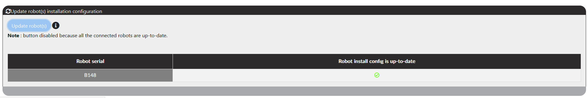 Vérifier qu’à la fin de l’update du robot, il y ait un symbole v vert dans ‘Robot install config is up to date’