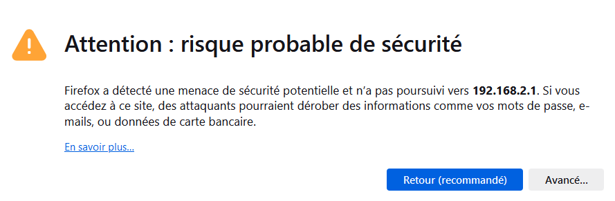 Il est fort probable que votre navigateur indique qu’il y ait un risque probable de sécurité. Pour Firefox, il faudra cliquer sur Avancé et Accepter le risque et poursuivre.