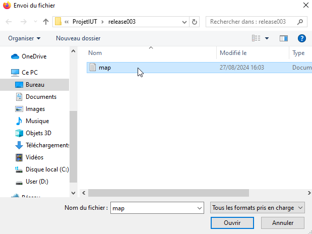 On clique sur Map Import et l’on upload le fichier map.geo que nous venons de générer avec Map Fabric. Ce fichier se trouve dans le répertoire Release. Avant de le charger, on vérifie que la date et l’heure de création du fichier est cohérente avec le moment où l’on a crée la release.
